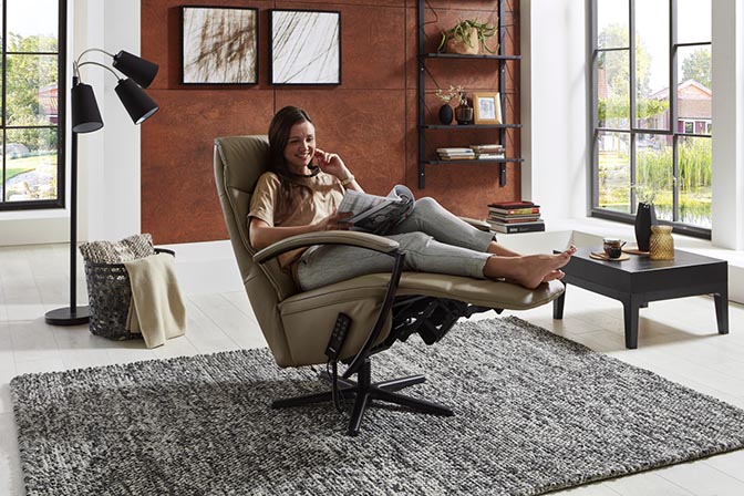 3 motoren inclusief sta op hulp (afbeelding in gallerij ontbreekt) waarmee de relaxfuncties altijd onafhankelijk en traploos te verstellen is in iedere gewenste stand en de fauteuil omhoog gezet kan worden. De bediening kan middels de fraaie afstandbediening die magnetisch aan de armleuning bevestigd kan worden. Optioneel kan er zelfs een ingebouwde accu worden voorzien waardoor kabels geen hinder hoeven te geven.